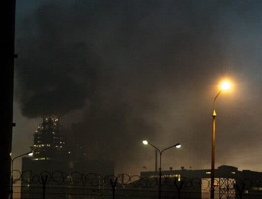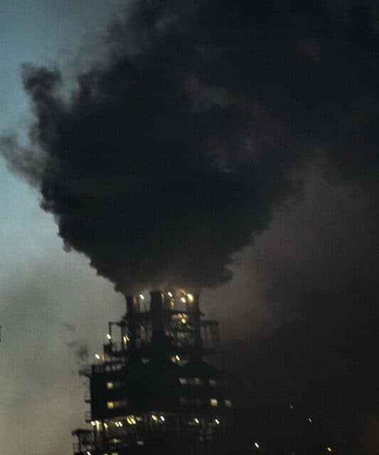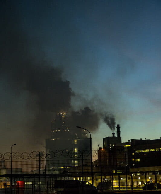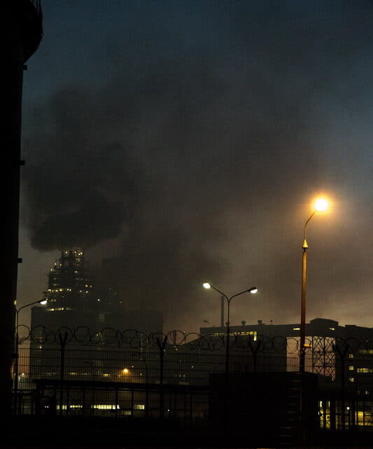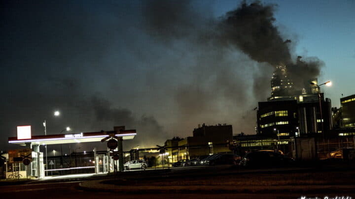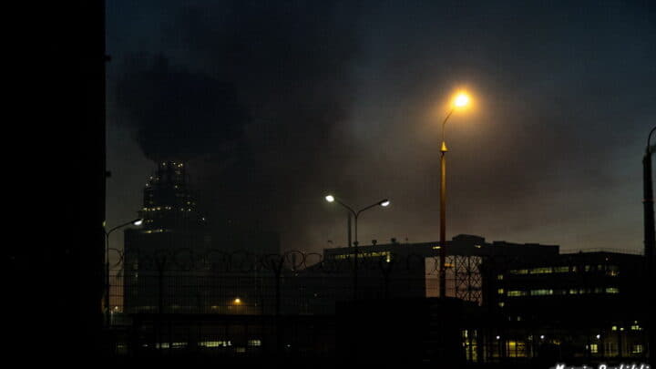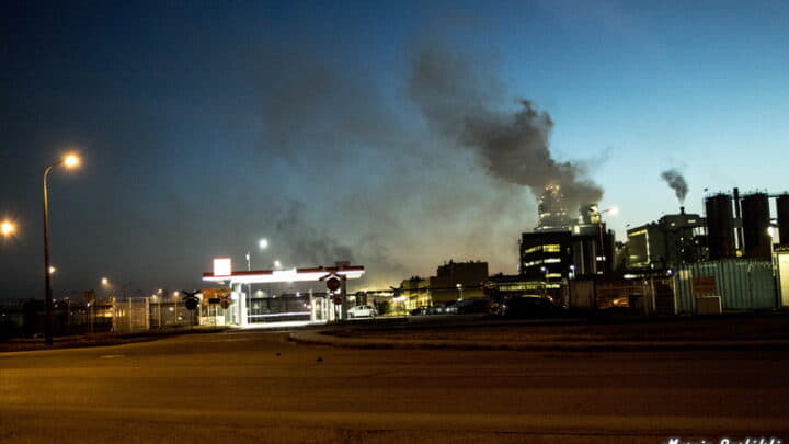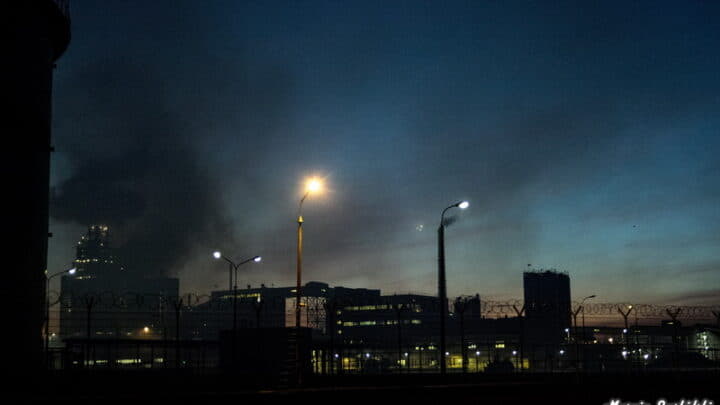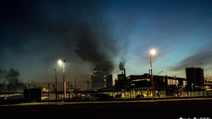 Stwierdziłem, że warto także zrobić kilka zdjęć „azotów” aparatem od strony Wisły. Podjechałem od tyły zakładów i zobaczyłem zupełnie inny widok niż około 20 minut wcześniej. Biały dym / para zamienił się w kłęby czarnego dymu. Nie jestem w stanie powiedzieć czy to dzieje się często i w jakiej porze. Przejeżdżam tą trasą dość często ale gównie w dzień. Nie pamiętam abym widział tak czarne kłęby dymu. Co ciekawe Ten czarny dym wydobywał się z kominów z których wcześniej leciał zupełnie biały dym lub para wodna. Byłem tam około 10 minut robiąc zdjęcia. Czułem momentami bardzo nieprzyjemny zapach i podrażnione gardło. Zaczęła także delikatnie boleć mnie głowa.